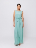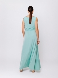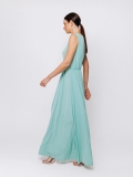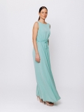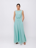 La linea svasata e fluida accompagna il movimento del corpo con grazia, mentre lo scollo a barchetta valorizza delicatamente la silhouette. La coulisse regolabile in vita permette di modulare il volume dell’abito, creando una vestibilità personalizzata e femminile.