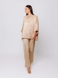 The loose fit, defined by the 3/4 kimono sleeve and relaxed construction, creates a contemporary silhouette that combines comfort and sophistication. The classic collar and center button placket complement the flowing volume of the garment, creating a perfect balance between sartorial rigor and formal freedom.