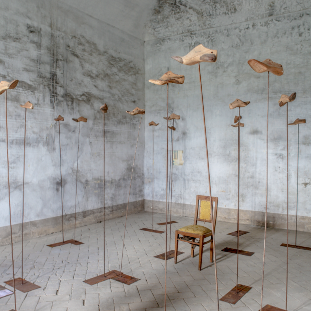 Le sagome in legno si stagliano alte, in precario equilibrio, un parallelismo voluto, atto a preservare in noi il ricordo dell’instabilità di tutti i giorni...