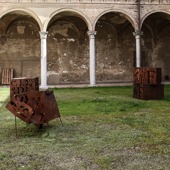 Nello storico show room Martino Midali di via Fratelli Bronzetti e nella sua affascinante corte uno scenografico allestimento accoglierà gli ospiti. Un inaspettato salotto all'aperto con divani e comode sedute inframezzati dalle opere dell'artista. Cubi pieni con lettere incise, parole e grafismi adagiati nello spazio, poggiati a terra come elementi di arredo tra strutture di giochi di parole, conducono il visitatore dentro un mondo fatto di dialoghi.