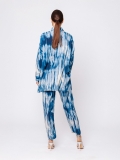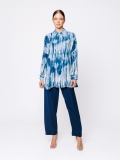 Indossata con il pantalone coordinato crea un completo fluido e scenografico. Per un look più equilibrato e versatile può essere spezzata con pantaloni o gonne in tripla georgette blu tinta unita, che valorizzano la stampa mantenendo l’insieme raffinato.