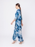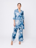 La stampa blu acquerellata su viscosa 100% crea un effetto visivo dinamico che rende il capo protagonista del look.