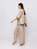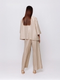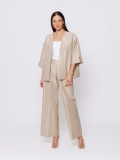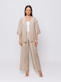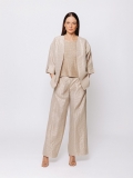Questa giacca lineare aperta interpreta il concetto di eleganza rilassata attraverso un tessuto a righe laminate orizzontali che riflette la luce con discrezione, creando profondità visiva e movimento.