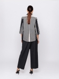 Il jacquard misto lino e cotone conferisce rilievo e struttura alle righe, trasformandole in elemento architettonico. La freschezza della fibra naturale incontra una costruzione precisa, dando vita a un capo autorevole ma leggero.