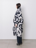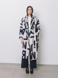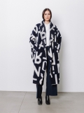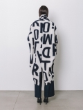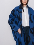 La lunghezza decisa e il drappeggio morbido del collo a scialle rendono questo cappotto uno dei capi più iconici della capsule Lettering. Le lettere, in bianco sul blu, si rincorrono sul tessuto come un messaggio in movimento, disegnando una silhouette fluida e raffinata.