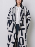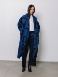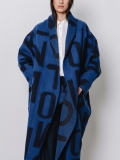 La lunghezza decisa e il drappeggio morbido del collo a scialle rendono questo cappotto uno dei capi più iconici della capsule Lettering. Le lettere, in blu sul bianco, si rincorrono sul tessuto come un messaggio in movimento, disegnando una silhouette fluida e raffinata.