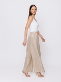 Realizzato in tessuto a righe laminate orizzontali, il modello presenta una linea ampia e fluida che valorizza il comfort senza rinunciare alla raffinatezza. L’elastico in vita garantisce vestibilità naturale, mentre la caduta morbida del tessuto crea un effetto dinamico e sofisticato.