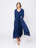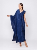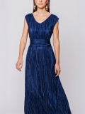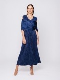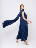 La scelta del plissé blu rafforza ulteriormente il carattere raffinato della proposta: una tonalità intensa e profonda, ideale per occasioni speciali, che unisce modernità e classicità e rende il capo facilmente adattabile a contesti diversi, dalla cerimonia formale a un evento serale più contemporaneo.